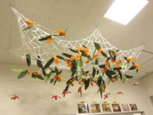 北分館ではそんな秋をイメージしたキンモクセイと赤とんぼの装飾を展示しています。